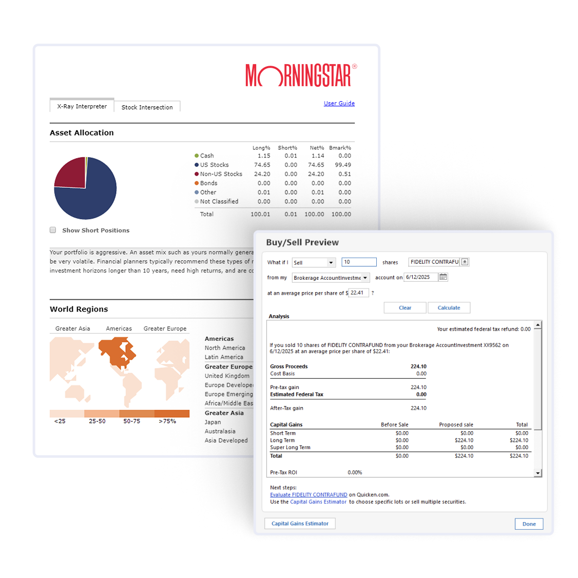 Get serious insights into performance with IRR, ROI, dividend tracking, & tax-aware lot analysis. Use Morningstar X-Ray® to evaluate allocation, fund ratings, risk — and fine-tune your strategy. Your whole portfolio, optimized.