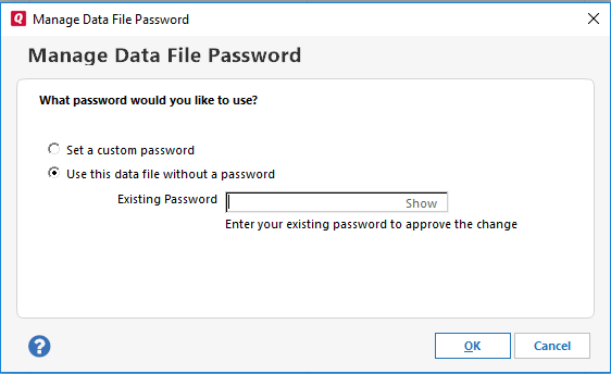 Click OK. After you set up a file password, you can't open the file unless you enter the password correctly. If you cannot remember your password, click Forgot password. Quicken also offers a