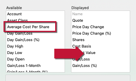 - Find Average Cost Per Share in the Available list on the left and drag it to the Displayed side. The location of the column in the register is determined by its position in the Displayed list.