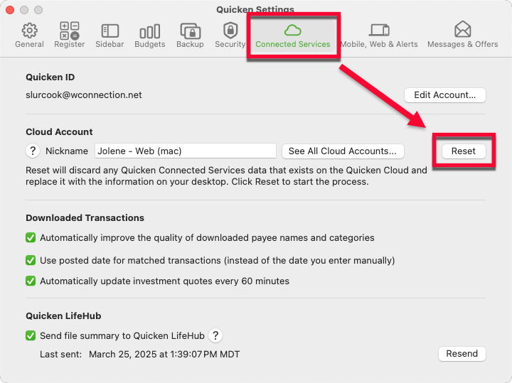 3. Click Reset your cloud data in the Quicken Mobile & Web pane.